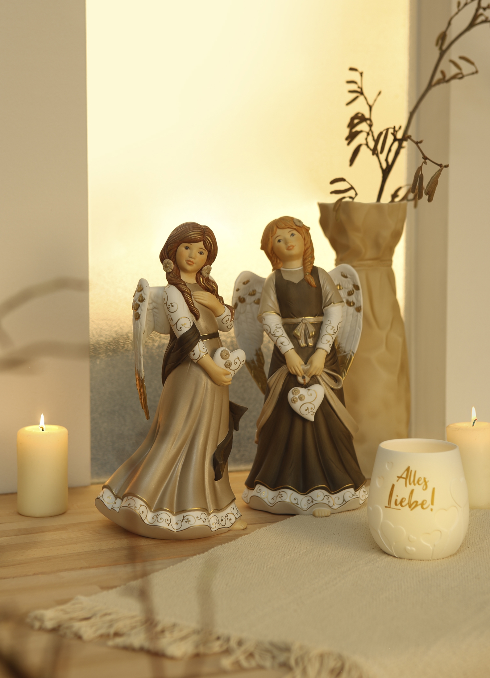 Mit all ihrer Liebe verschenkt diese Himmelsbotein ihr Herz. Die Anmut dieses schönen Wesens wird betont durch goldfarbene Ornamente und die Leichtigkeit, mit der sich der feine Stoff des Kleides und des Schals zu bewegen scheinen.
