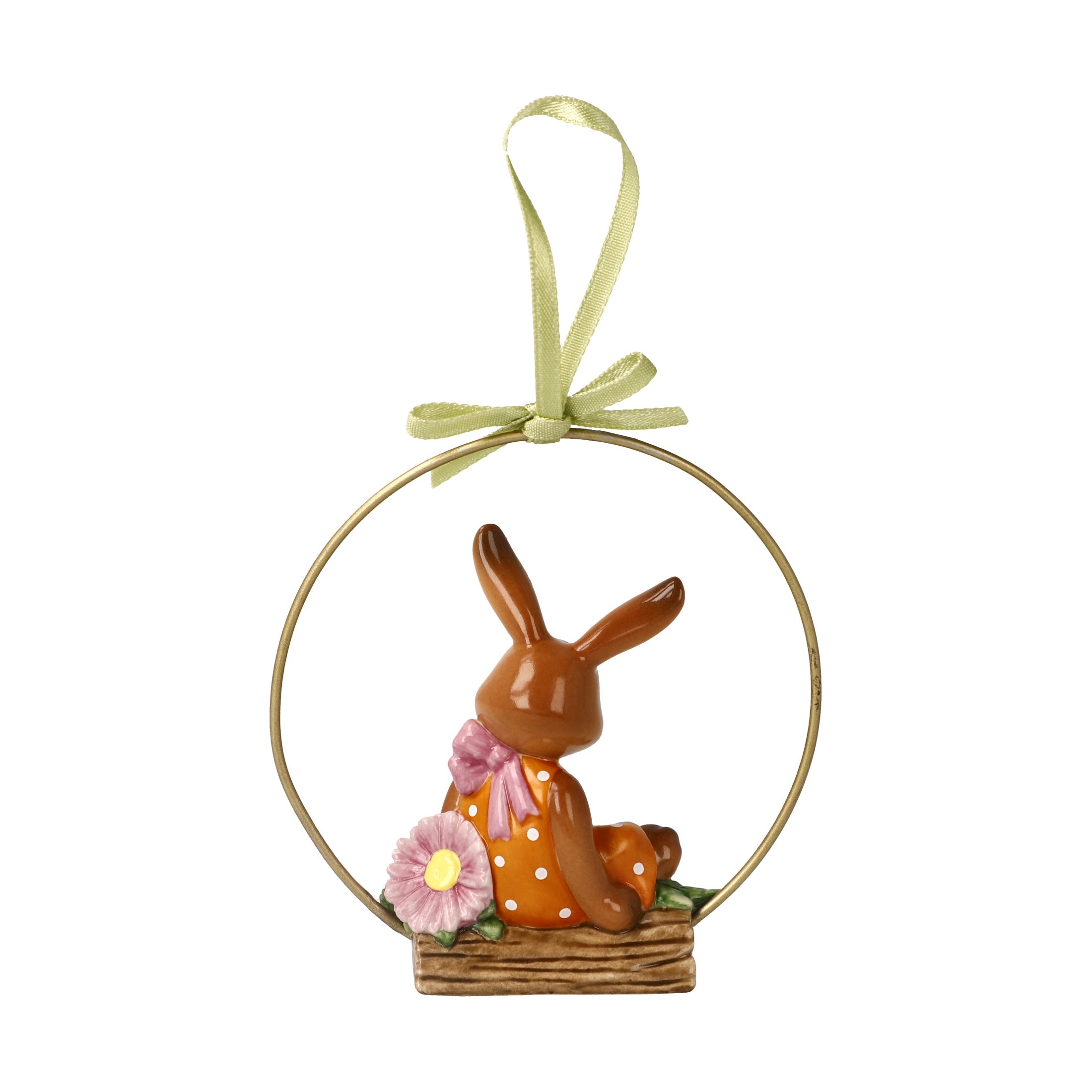 Mamas Liebling sitzt entspannt auf der mit Blumen geschmückten Bank – fast, als würde sie Modell stehen. Der filigrane Metallring rahmt die Szene nicht nur dekorativ ein, sondern ist dank Schleifenband auch perfekt zum Aufhängen an Tür oder Fenster geeignet.