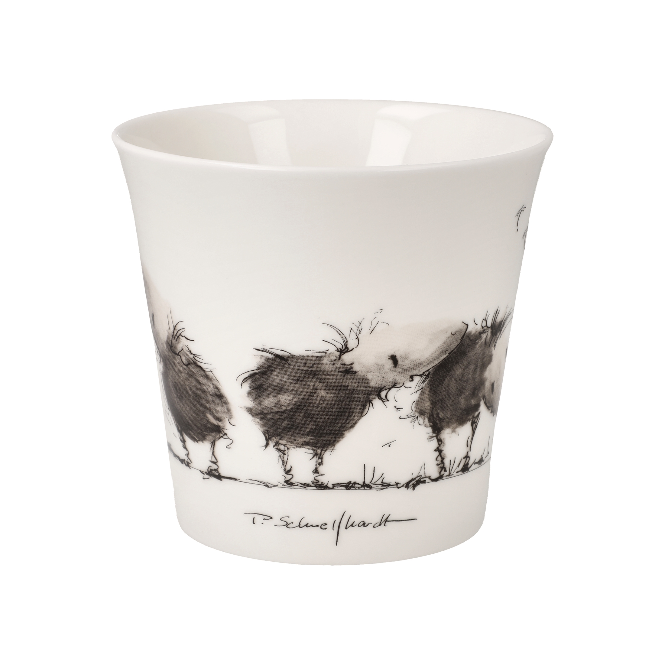 Ein kleiner neugieriger Rabe beobachtet eine Schnecke, liebevoll in Schwarz-Weiß illustriert. Aus leichtem Fine Bone China gefertigt, wird jeder Tee- oder Kaffeegenuss zum kleinen Kunstmoment.